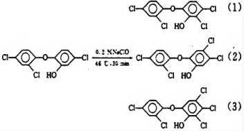 抗菌防臭整理劑按其化學(xué)結(jié)構(gòu)可分為:醇類、酚類、醛類、酯類、醚類、腈類、鹵素類、吡啶、喹啉類、噻唑類、雙胍類、二硫化合物、硫代氨基甲酸酯類、(多)糖類、表面活性劑類、無(wú)機(jī)化合物、金屬類以及天然化合物等。但有些抗菌防臭整理劑有不良的副作用,已禁止在服裝面料方面使用。如著名商品Irgasan DP300,其學(xué)名為2,4,4'-三氯-2'-羥基二苯醚,其整理產(chǎn)品與含氯漂白劑作用后,會(huì)生成三種有毒的氯化物,反應(yīng)式如下: