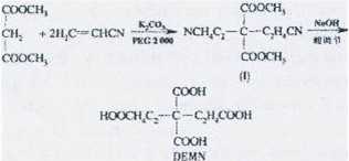 棉、麻、絲織物及粘膠纖維在紡織印染過程中易產生劇烈的收縮,自身又缺少彈性,防皺性較差.為克服以上缺點,需對上述纖維進行化學防皺整理.隨著國內外對綠色環保的日益重視,開發無甲醛整理劑代替傳統的N一羥甲基酰胺類整理劑已成為必然的發展趨勢.[1-31近年來,國內外對棉織物的低甲醛或無甲醛化學抗皺整理的研究非常多,其中多元羧酸1,2,3,4一四羧酸丁烷(BTCA)是一種性能優良的無甲醛抗皺整理劑,但成本過高,很多印染廠無法承擔4引]活潑亞甲基化合物的邁克爾加成反應是有機合成中制備多羰基化合物的一類重要反應,對其反應體系的研究一直受到廣泛的重視[8-121本文以丙二酸二甲酯和丙烯腈為主要原料,利用活潑亞甲基化合物的邁克爾反應,以PEG2000為相轉移催化劑,無水碳酸鉀為堿劑,正己烷為溶劑,合成得到了目標產物DEMN(4,4一二甲酸基一1,7一庚二酸).并將DEMN應用于棉織物的抗皺整理,通過折皺回復性能、白度及強力保留率(BSR)表征該無甲醛整理劑的抗皺效果.合成過程如下: