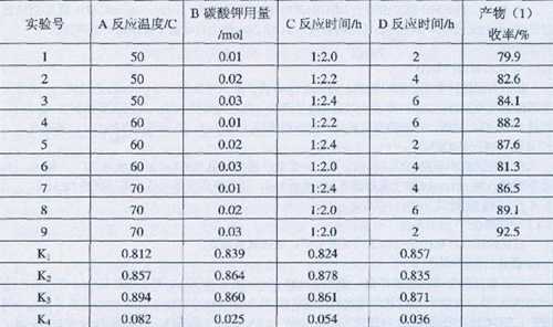 由表1可知,產物(I)合成的最優方案為A382C2D3,即碳酸鉀用量為0.02mol,反應原