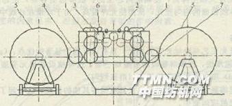 布鋏絲光機、直輥絲光機、直輥布鋏絲光機每天的加工能力在6萬米以上,對于日產2萬米多品種、小批量的絲光織物而言,應用短流程打卷直輥絲光機,具有占地面積小、投資少、節能減排的效果。 (1)YMH218短流程直輥打卷絲光機的特點 ①結構特點 圖3—33明示,本機由5支直輥上下交錯排列組成。一直輥槽3,兩臺軋車1,兩對被動打卷和退卷裝置4、5,積液槽體7組成,直輥槽上兩對噴淋裝置2和兩支小壓液輥6和兩對刮刀,本機對稱設計,往復式運行,全機長僅6m。本機設有供堿噴淋系統、熱水交換沖淋系統、堿回收系統、循環過濾系統。