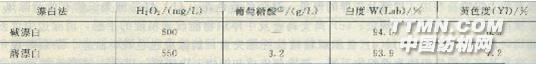 織物: 330g液量: 10L退漿: α-淀粉酶(超濃)lOg/L 表面活性劑0.5g/L精練:氫氧化鈉 2g/L表面活性劑 0.5g/L漂白: 過氧化氫 600mL/m3 硅酸鈉 2g/L 氫氧化鈉 1g/L 表面活性劑0.5g/L使用機械: 回轉釜染色機 圖3 18堿漂白工藝過程 表3-47漂白液中的過氧化氫濃度和漂白織物白度