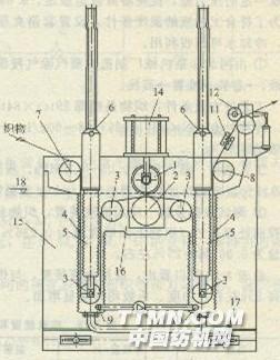 圖3—10高給液裝置1-可調(diào)壓力加壓輥;2一主動輥;3液下導(dǎo)布輥;4固定波形槽板;5一可升降活動波形板;6一升降汽缸;7一進布輥;8一導(dǎo)布輥;9一回液管;10一進液管;11一刮液器;12一牽曳軋輥;13一泵;14一加壓汽缸;15一機架;16一液槽;17一清洗排放管路;18-液面 ①施液過程織物經(jīng)進布導(dǎo)布輥7,進入預(yù)浸漬槽,該槽由固定波形槽板4及活動波形板填充體5構(gòu)成,填充體由升降汽缸6升降操作,方便穿布、清洗,織物由4與5構(gòu)成的狹縫中穿過,經(jīng)液下導(dǎo)布輥3(固定在波形板填充體底部),進入中固輥均勻軋車,織物經(jīng)液下軋液后進入增效浸漬槽(結(jié)構(gòu)與預(yù)浸漬槽相同),充分透芯帶液出槽,導(dǎo)布輥8上方是刮液器11,刮去浮于織物表面的工作液,進入牽曳軋輥1