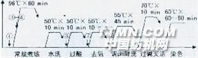 傳統的棉針織物煮練、漂白工藝大多采用燒堿和雙氧水在高溫條件下進行。若燒堿用量控制不當,常會對纖維造成嚴重損傷。由二f燒堿與雙氧水協同性差,需使用大量的助劑,使工作液穩定,進而又導致多次水洗,加重污水處理負擔。 目前,本公司新開發了新型環保性的生物酶前處理工藝,并將其應用于棉針織物的精練中。本文將該工藝與傳統精練工藝在工序、效果和成本等方面進行比較,以證明該酶制劑工藝的可行性。1 試驗1.1材料及設備 織物14.8 tex/4.4 tex(40 D)棉針織物 助劑生物精練酶DM-8654,酸性纖維素酶DM-8636,高濃非離子滲透劑DM-1361(廣東德美精細化工股份有限公司)。 設備立信ECO-38常溫染色機。1.2試驗方法1.2.1傳統前處理工藝 配方/(g/L) ①除油滲透劑201 1.0~2.0 ②碳酸鈉 3.0③雙氧水(27.5%) 6.0④燒堿 2.0⑤醋酸 1.0⑥酸性纖維素酶DM-8636 0.80⑦去氧酶DM-8697 0.10工藝條件