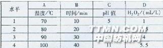 0 前言 聚乙烯醇(PVA)漿液黏度穩(wěn)定,漿膜強(qiáng)力、耐磨性和抗屈曲強(qiáng)度均佳,被廣泛應(yīng)用于滌棉、維棉等混紡織物的經(jīng)紗上漿。但是,PVA可生化性能較差,其BOD5/COD值僅為0.064。采用一般氧化退漿法雖能降解PVA,但是效果不佳,而且退漿時(shí)需加入氫氧化鈉,退漿后織物也需大量水洗才‘能達(dá)到中性,此外,退漿廢水的pH值也較高,需要大量酸中和方可排放。“十一五”期間,工廠將面臨每噸纖維耗水量比2005年降低20%,單位產(chǎn)值的污水排放量比2005年降低22%的壓力。自2007年7月1日起,江蘇省率先調(diào)整排污費(fèi)征收標(biāo)準(zhǔn),將污水排污費(fèi)由0.7形污染當(dāng)量提高到0.9形污染當(dāng)量,并將逐步提高至1.4形污染當(dāng)量。因此,退漿殘液中PVA的降解和節(jié)能省耗前處理工藝逐漸引起人們的廣泛關(guān)注。本課題采用活化劑活化雙氧水法對(duì)滌棉織物進(jìn)行退漿,通過(guò)正交試驗(yàn)初步分析了H2O2用量、退漿溫度、時(shí)間和pH值對(duì)退漿率、退漿廢水中PVA降解率、織物強(qiáng)力和白度的影響,得出了較優(yōu)的退漿工藝。1 試驗(yàn)1.1材料與儀器 藥品硼酸、碘、碘化鉀、雙氧水(30%)(以上均為分析純)、雙氧水活化劑ZSU(自制)。 織物滌棉織物(90/10,29.4 tex X45.2 tex);上漿率10%~11%,其中PVA 70%,淀粉30%,織物密度2013。 儀器水浴鍋(北京長(zhǎng)安科學(xué)儀器廠)、棱光UV-762紫外/可見(jiàn)光分光光度計(jì)(上海精密科學(xué)儀器有限公司)、SC-80A白度儀(北京康光儀器有限公司)、YG065型電子織物強(qiáng)力測(cè)試儀(萊州電子儀器廠)。1.2試驗(yàn)方法 將一定量的雙氧水活化劑ZSU(H202與ZSU的質(zhì)量比為0.6)加人浴比為l:50的溶液中,調(diào)節(jié)