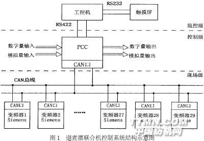 退煮漂聯(lián)合機(jī)是將坯布進(jìn)行退漿、煮煉、漂白的印染前處理設(shè)備。Brubomatic E Ⅱ型寬幅退煮漂聯(lián)合機(jī)是世界聞名的荷蘭BRUGMAN 公司生產(chǎn)的新型設(shè)備之一,它在傳統(tǒng)退漿、精煉、漂白工序的基礎(chǔ)上,實(shí)現(xiàn)了工藝的縮短與合并,效率高、適用廣。其工藝流程為:進(jìn)布--預(yù)洗--浸漬--漂白--后洗--烘干--出布其中進(jìn)布、出布單元由連續(xù)進(jìn)布裝置和連續(xù)出布裝置構(gòu)成;預(yù)洗,即浸漬前的洗滌,由前3 臺(tái)水洗箱組成;浸漬后的漂洗,即后洗,由后4 臺(tái)水洗箱組成;浸漬工序在浸漬槽中完成對(duì)化學(xué)藥品的浸漬;漂白工序在有鋼型履帶的蒸箱中完成;烘干工序由3套筒形干燥機(jī)完成。1 系統(tǒng)概述Brubomatic E Ⅱ型退煮漂聯(lián)合機(jī)在控制結(jié)構(gòu)上是一個(gè)典型的現(xiàn)場(chǎng)總線控制系統(tǒng)。它采用先進(jìn)的交流變頻調(diào)速和微機(jī)控制、網(wǎng)絡(luò)通信技術(shù),達(dá)到了機(jī)臺(tái)之間的同步協(xié)調(diào)和廣調(diào)的速比范圍,實(shí)現(xiàn)了各種工藝參數(shù)的在線檢測(cè)和自動(dòng)控制,提供了簡(jiǎn)潔明了的人機(jī)界面。特別是采用了現(xiàn)場(chǎng)總線CANBUS 的通信技術(shù),大大提高了整臺(tái)機(jī)器的運(yùn)行可靠性和工作穩(wěn)定性。整臺(tái)設(shè)備集自動(dòng)化、計(jì)算機(jī)、網(wǎng)絡(luò)、通信技術(shù)于一體,效率高,適用廣,屬同類設(shè)備中的先進(jìn)產(chǎn)品。其控制系統(tǒng)結(jié)構(gòu)框圖如圖1 所示。