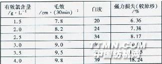2.2氯漂2.2.1 工藝流程及工藝處方 煮坯紗牽引→松扣→浸漂(NaCl0,有效氯含量2.8g/L)→瀝水氧化→淋沖水洗→酸洗(硫酸2g/L)→瀝水淋沖→脫氯(硫代硫酸鈉8g/L)→瀝水沖洗→出池水洗(溫度為室溫)2.2.2有效氯含量對漂白效果的影響表2有效氯含量對漂白效果的影響