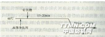 ①工藝配方: 1# 2# 3# 碳酸鈉(100%) 10—15 g/L 一 一 燒堿(100%) 一 5—10 g/L 一 雙氧水(100%) 15—20 g/L 15—20 g/L 一 高效凈洗劑(溢流機處方) 一 一 O.5&md