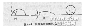 水滴在未經(jīng)過(guò)染前處理的棉織物上呈圓珠形,在經(jīng)過(guò)練漂等前處理后的織物上迅速潤(rùn)濕擴(kuò)散。這些是液體表面具有的特殊性能而產(chǎn)生的現(xiàn)象,也就是表面張力現(xiàn)象。 棉織物在未經(jīng)練漂等前處理前,由于纖維素部分共生物(如果膠)的阻礙,使纖維素的潤(rùn)濕能力很低,其原因是水分子和棉纖維間的吸引力小于水分子和水分子之間的吸引力,因而水和未經(jīng)過(guò)練漂等前處理的纖維接觸時(shí),水分子的內(nèi)部作用使水滴呈球形。當(dāng)果膠等被去除后,水分子與棉纖維之間的吸引力大于水分子與水分子之間的吸引力,纖維就呈現(xiàn)潤(rùn)濕。 潤(rùn)濕角是用數(shù)字來(lái)表示織物的潤(rùn)濕程度、潤(rùn)濕和界面張力的關(guān)系。圖4—1中的。就是潤(rùn)濕角,凡。接近0時(shí)表示潤(rùn)濕好[圖4—1(b)];⊙為180。時(shí)表示完全不能潤(rùn)濕[圖4—1(c)];。越接近180°則表示越難潤(rùn)濕。