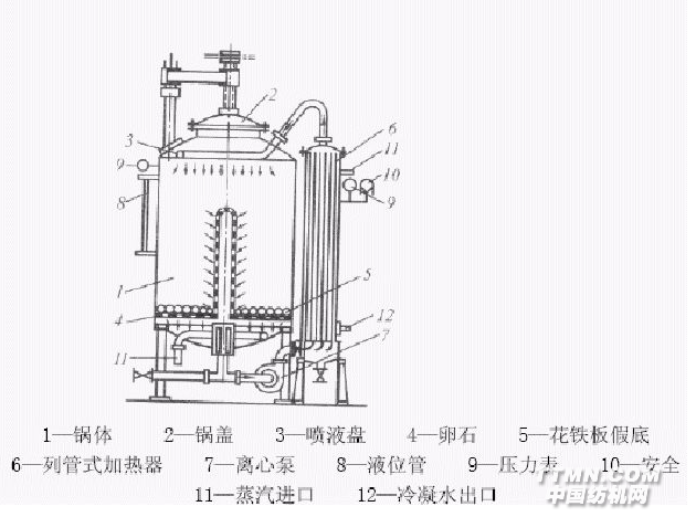鍋身是煮布鍋主體,一般高約3m,直徑約2.5m,鍋內容布重量即是煮布鍋的容量,煮布鍋容量有2.5t、3t 等多種。鍋內上口裝有淋灑管,鍋底稊上處裝有鐵柵或花鐵板構成的假底,假底上堆有卵石,煮練時織物堆積在卵石上,上與假底接觸,以免沾污鐵銹及堵塞假底孔隙,使練液能夠循環通暢。在假底與真底之間,裝有直接蒸汽管,為煮練開始時快速加熱用。鍋身上部裝有汽壓表、安全閥、排汽管,鍋身上側裝有液位指示管,鍋身下部還有排液管,并有與外循壞泵相連的循環管。外加熱器為列管式加熱器,加熱器內有數十根鋼管,上下兩端分別與鍋身相通,鋼管內流通煮練液,管外通蒸汽,對管內煮練液間接加熱。外加熱器與鍋身的管路間裝有循環泵,使鍋內煮練液強制循環。為保持鍋身溫度及防止散熱,鍋身及加熱器外壁都用石棉包扎保溫。織物煮練時,練液通過布層流至鍋底,由循環泵抽出送經外加熱器,再通過鍋口的淋灑管噴入鍋內,透過堆積鍋內的織物,重夊循環至煮練過程完成。煮布鍋煮練的工藝流程如下:軋堿→進鍋堆布→煮練→水洗→出布。