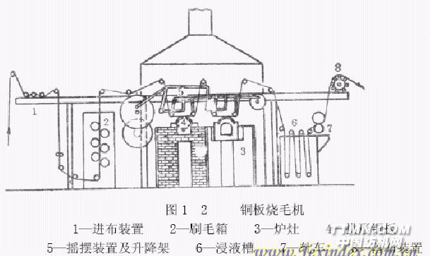 燒毛方法有兩種,即燃氣燒毛與赤熱金屬表面燒毛。前者利用可燃性氣體燃燒直接燃去織物表面絨毛;后者為間接燒毛,即將金屬板或圓筒燒至赤熱,再引導織物擦過金屬表面燒去絨毛。與這兩種方法相應的燒毛設備,有氣體燒毛機(無接觸式燒毛)、銅板燒毛機和圓筒燒毛機。氣體燒毛機操作方便,適應性廣,目前各廠普遍采用氣體燒毛機。銅板及圓筒燒毛機勞動強度高,工作條件差,除燈芯絨廠尚在使用外,已應用上多。見圖l-1、圖1-2。