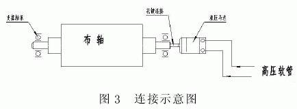 如圖2所示:啟動電機3,液壓泵2開始工作,此時,系統無壓。當手動換向閥6動作時,系統建立壓力,調整溢流閥4至所需壓力,示數由壓力表5讀取。打開截止閥7,同時調節節流閥8,使液壓馬達9達到5~6r/min。液壓馬達為終端力矩輸出元件,它通過花鍵直接與布軸軸端聯接,帶動布軸轉動。如圖3所示。