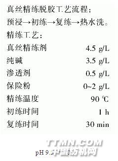 真絲一般在堿性條件下用精練劑進行脫膠,由于精練劑的主要成分是凈洗劑,所以精練時也有洗毛的作用。且織物中含有氨綸,故精練時必須控制pH值,在不影響精練效果的前提下,控制最低的pH值,使氨綸的彈性和形變的影響為最小。
