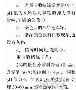 真絲產品的成衣染色采用上述三種方法處理,會解決一些問題,但為了徹底解決絲羊絨成衣精練中存在的問題,可采用蛋白酶進行精練脫膠。實踐證明用蛋白酶精練脫膠有下列優點: 選用液態蛋白酶TINOZYMWSL NEW和蛋白酶PR進行試驗,并投人了大批量生產。對于100%的真絲或者粗支真絲的精練,pH可在10下進行。對于薄形真絲產品或真絲的混紡產品例如絲羊絨),精練的pH可在8.5一9.5范圍內進行,精練時間為30 mim為了檢測真絲脫膠程度,可用下列方法來測定: