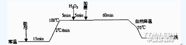 莫代爾纖維比棉纖維細,其纖維橫截面為均勻圓形,其纖維縱向不像棉纖維具有天然的三維卷曲,在濕處理的情況下,更多的纖維端從紗線中游離出來,產生表面起毛、起球的傾向。因此要求各工序都要盡量保持低張力和低速度,以減少摩擦,從而減少起毛、起球和破洞現象的產生。1煮漂 若莫代爾針織布用于染暗淡的顏色,則前處理時對布面白度要求不高,只需對其進行煮練去除紡絲和織造過程中上的油劑及蠟質即可。若用于染鮮艷的顏色則對布面白度要求高,為了節省水電汽以降低生產成本,采用在煮練浴中加人雙氧水的煮漂一浴法工藝。莫代爾纖維的特殊超分子結構使其容易產生拆痕和破洞,因此要采用比棉針織物溫和的煮漂工藝條件。實踐證明采用堿性強的燒堿煮漂會對莫代爾針織布造成損傷,因此把棉針織物煮漂配 方中的燒堿改成堿性較弱的純堿。為了取得更好的防皺和抗起球效果,在煮漂浴中加入防皺劑LBH和抗起球劑。升溫過程一定要緩慢,煮漂完成后,要自然降溫至70℃才能水洗。1.1煮漂一浴法工藝配方 30%雙氧水(o.w.f)(%) 8 純堿(%) 2.5 硅酸鈉(%) 1 精練劑(%) 0.5 防皺劑LBH(%) 1.5 抗起球劑(%) 1 浴比 1:15 溫度: 100℃ 時間: 60min1.2 加工工藝曲線: