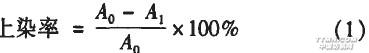 1.3.2表觀染色深度(朋值)采用Datacolor 600電腦測色儀測試染色織物的表觀顏色深度K/S值。1.3.3耐摩擦色牢度按GB/T 3920--1997(紡織品.色牢度試驗耐摩擦色牢度》分別測試耐干、濕摩擦色牢度。1.3.4耐水洗色牢度按GB/T 3921.1一1997《紡織品色牢度試驗耐洗色牢度:試驗l》測試。1.3.5頂破強力按GB/T 19976--2005《紡織品頂破強力的測定鋼球法》測試。2 結果與討論2.1染色溫度對上染率的影響按1.2節染色工藝,染料用量l%(owf),元明粉用量30 g/L,改變溫度(75,85,95℃)進行染色,測定染色織物的上染率,結果見圖1。