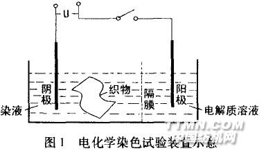 說明:(1)電化學反應池為長方體石英玻璃制成,其中陽極槽容積為2.5 cm x 6 om×7 cm,陰極槽容積為10 cm x6 cm x7 cm,兩槽之間由Nation膜為隔膜隔開。(2)陽極為貴金屬氧化涂層的網狀鈦電極;陰極為銅片,厚度0.2 mm。(3)陽極電解質溶液為35 L硫酸溶液;陰極電解質溶液(染液)由還原黃G、氫氧化鈉、硫酸鐵、酒石酸