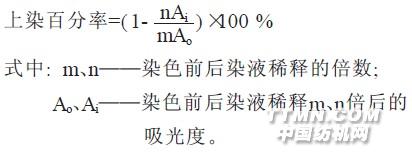 該試劑易溶于水, 具有良好的熱穩定性。分子量較低, 在預處理棉時易滲透纖維; 含氮量適中, 留有較多氯甲基反應性基團〔1〕。在堿性條件下, 纖維素離子為親核試劑, 該聚合物中的氯甲基能與親核試劑反應, 而且, 堿性條件下聚合物的末端基團也能轉化為環氧基與纖維素反應, 纖維素與改性劑的反應性強。改性后染色時能大幅度降低纖維素纖維的負ξ- 電位, 用活性染料在無鹽中性條件下染色,使染料上染百分率大大提高, 染色殘液中色素大大減少。1 實驗1.1 材料及藥品21/21純棉絲光平紋織物聚環氧氯丙烷胺化物( 東華大學提供) ; 活性嫩黃K- 6G、活性紅K- 2G、活性藍K- R、活性紅B-2BF、活性黃B- 4RFN、活性藍B- 2GLN; 燒堿、二甲基甲酰胺。1.2 儀器及設備HH- S型恒溫水浴鍋、722型分光光度計、Y571B型耐摩擦色牢度儀; 耐洗色牢度儀( 自制) ; FA-2004電子天平。1.3 工藝流程1.3.1 改性工藝浴比1∶50, 初始溫度40 ℃, 以2 ℃/ min的速度升溫至95 ℃, 保溫處理50 min, 取出水洗至中性。1.3.2 改性后染色工藝染料用量2 %( owf) , 浴比1∶50, 染色時間60min, K型活性染料的染色溫度為90 ℃, B型活性染料的染色溫度為65 ℃, 染色后水洗、熨干。1.4 試驗結果的測定1.4.1 上染百分率的測定使用722型分光光度計, 在所選用染料的最大吸收波長處測出染色前后染液的吸光度。按下式計算上染百分率。