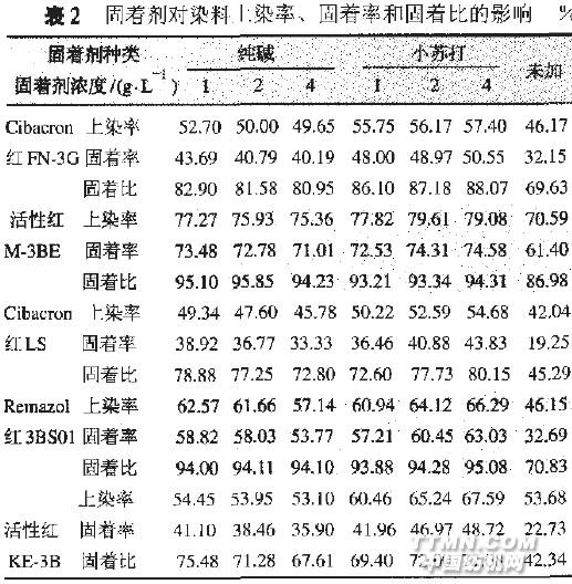 試 驗結 果 見表2。試驗結果顯示,不論何種a}Ir f基染料,加固著劑與不加固著劑相比,固著率都有不同程度的提高,固著比也有明顯提高,意味著染色牢度也可能提高。說明真絲綢活性染料染色時,堿性固著劑是需要的從 固著 劑種類來看,純堿的堿性雖然比小蘇打大,但以小蘇打作為固著劑的固著率卻比較高。原因是堿性強雖然促使染料與纖維反應的作用大,但促進染料的水解作用也大。從表2也可以看出,純堿的用量愈高,固著率反而愈低。此外,也與桑蠶絲素上可與活性染料反應的基團有關。從這些基團的種類及其含量來看,側鏈不含伯輕基的絲氨酸含量最高,但它主要存在于絲素的結晶區,染料很難進入結晶區,所以與活性染料反應的幾率很小。能與染料反應的主要是氨基、亞氨基及酪氨酸上的酚努基,前者的親核性較好,而后者酚經基具有一定的弱酸性, 在較低堿性條件下,即可形成負離子所以在較弱堿性條件下,兩者都可以較好地與活性染料發生親核取代或加成反應。