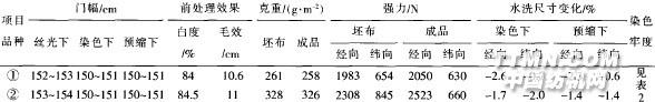 2 前處理一個新品種的染整開發成功與否.前處理的成功與否起著關鍵性的作用.公司在開發該品種之初曾試用常規長車“退煮-氧漂”方法來進行前處理工藝.雖在白度、毛效、去雜等方面已完全達到染色要求.但因該品種厚密的正面為經浮滌綸纖維.在常規的松堆汽蒸過程中.織物在蒸箱內折疊堆壓.和導布履帶接觸處極易產生滌綸纖維燙傷印痕和橫檔折痕.影響布面質量。故常規的松堆汽蒸煮漂工藝不適應該產品的生產 為此.采用“冷軋堆一緊式短蒸水洗”工藝,取得了非常好的前處理效果(見表1)。表1 滌