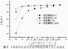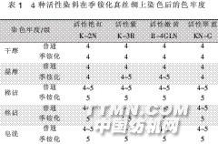 分別在3 min后和4 min后完成。上染結束后4種染 料的吸附率都達到100%。染色殘液無色透明,完全 看不到有染料的殘留。染色過程中不需要加硫酸鈉進 行促染。 用碳酸鈉進行固色的過程中,固色液也無色透明, 4種染料的上染率都達到100%。煮浮色時,煮液也無 色透明,固色率也達100%。 活性染料與真絲綢之間的化學反應效率不可能達 到100%,一定有部分染料被水解,產生浮色,相當于直 接染料吸附在真絲綢上。但是,在煮浮色時,這些浮色 卻不會被煮下來,表明接枝在真絲綢的季銨陽離子與 染料分子的電荷作用加上染料分子與絲素蛋白范德華 力作用非常大,足以抵抗水分子的熱運動對其產生的 作用而不掉入水溶液中。這預示著其皂洗牢度會很高。 2.3季銨化真絲綢染色后的色牢度 表1是4種活性染料在季銨化真絲綢上染色后的 各種色牢度。從表1可以看到,干摩擦牢度沒有變化, 濕摩擦牢度有一定的升高。棉沾、絲沾、皂洗牢度都普 遍升高。這是季銨化真絲綢上的陽離子對陰離子染料 的強相互作用、以及染料分子與絲素蛋白的范德華力 作用的共同結果,使得染料分子牢牢地吸附在真絲綢 上,所以色牢度升高。