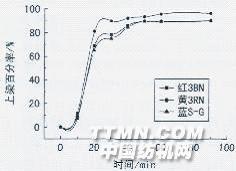 注:染料2%,元明粉80 g/L,純堿27 g/L。 表1中,有7只染料在真絲/棉交織物上的同色平衡值K為0.8~1.2,且色差△E≤1.5,可認為真絲/棉交織物的染色同色性較好;有10只染料在真絲/棉交織物上的同色平衡值K<0.8,且色差△E≥1.5,真絲/棉交織物的染色差異較大,并且棉深于絲;有3只染料在真絲/棉交織物上的同色平衡值K>1.2,且色差△E≥1.5,真絲/棉交織物的染色差異也較大,并且絲深于棉。 綜合考慮K/S值、K值和AE值,在7只同色性較好的染料(紅3BN、黃3RN、藍s-G、寶石紅s-3B、檸檬黃S-3G、超級紅RGB與翠藍G)中,選擇染料紅3BN,黃3RN和藍s-G作為三原色進行同浴染色。2.2上染速率曲線 為了解活性染料三原色紅3BN,黃3RN和藍S-G