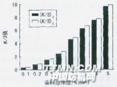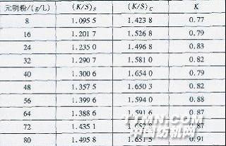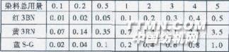 2 結果與討論2.1染料篩選 為使真絲/棉雙組分面料獲得良好的同色性,首先要選擇合適的活性染料。本試驗分別選用不同廠家的活性染料對真絲/棉交織物進行染色,通過分析其表觀深度K/S值與色差△E,篩選出同浴染色同色性較好的三原色染料。 表1 不同染料的染色同色平衡值置及色差△E