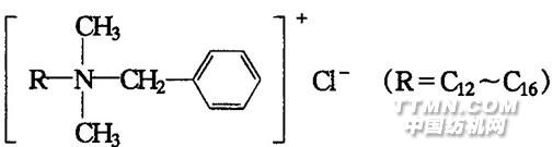 大多具有長(zhǎng)鏈烴基的季銨鹽,是帶有正電荷的無色化合物,在溶液中可以電離生成緩染劑陽離子。例如十二烷基二甲基芐基氯化銨(即緩染劑1227)