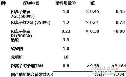 2、染料的飽和系數(shù)f(相對(duì)飽合值)纖維的飽合值除以染料的飽合值,所得的商。是指不同染料對(duì)標(biāo)準(zhǔn)染料在同一纖維上的飽合值的相對(duì)關(guān)系。飽和系數(shù)對(duì)某一陽(yáng)離子染料是一個(gè)常數(shù)判斷染料上染腈綸的能力f小,上染量高,濃色