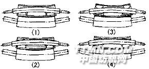 圖6 氣囊內支撐式軋輥線壓力調整示意從圖6 知,氣囊內支撐式均勻軋輥是通過調節輥體內部的氣囊壓力來獲得幅向所需的線壓力。圖6(1)為正向主、副氣囊均加壓形成線壓力一致的情況,圖6(2)為正向主氣囊不加壓形成中間線壓力低于兩端的情況,圖6(4)為一端副氣囊不加壓形成一端線壓力小的情況,而圖6(3)則是為了更大地降低兩端的線壓力而采用正向主氣囊、反向副氣囊加壓的方式。還有幾種加壓的組合方式可根據工作原理自行調節。邊中色差的調整與液壓內支撐式染色軋車的方法相似。