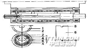 氣囊內支撐式染色軋車主要也是由軋液和加壓控制操縱系統(tǒng)組成。軋液部分除均勻軋輥結構不同外,其余與液壓內支撐式染色軋車相同。氣囊內支撐式染色軋車的軋液輥由一只普通結構軋液輥和一只輥體內裝有氣囊、具有新型結構的均勻軋輥組成。普通結構軋液輥為主動輥,均勻軋輥為被動輥。新型的氣囊內支撐式均勻軋輥內部結構見圖3。