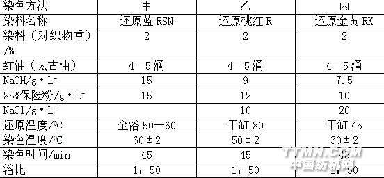 2.染液配制:干缸法:稱取染料→加入燒杯中→加太古油→調(diào)勻→加少量水→調(diào)勻→加入2/3的NaoH和保險粉→加入1/3的水→在規(guī)定溫度下干缸還原10—15min→加入剩下的1/3NaoH和保險及2/3的水→即配成染浴。全浴法:稱取染料→加入燒杯中→加太古油→調(diào)勻→加少量水→調(diào)勻→加保險粉、NaoH→加規(guī)定的水→在規(guī)定溫度下,全浴還原10—15min→即為染浴3.染色步驟: 將染液調(diào)到染色溫度→投入織物→染色10—15min→加入1/2NacL→再染10-15min→加入剩于的1/2 NacL→續(xù)染10—15min→取出織物→均勻擠干→攤開放在空氣中氧化15min→水洗→皂煮(肥皂2 g.L-、純堿2 g.L-、浴比1:30,95℃,10min)→水洗→晾干→貼樣。備注:還原染料染色后都要皂煮處理,皂煮目的有二,其一是為了去除聚集在纖維表面的浮色,以增加耐摩和耐洗色牢度;其二是為了獲得所需的色光。在隱色體被氧化后,染料只是以其單個分子與纖維素分子相作用而零亂地排列在纖維內(nèi)部,經(jīng)皂煮后,染料分子間互成結(jié)晶態(tài),而使色光穩(wěn)定。