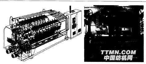 圖1 Vario Line卷染機(Otto-Pricken)意大利Brazzoli公司展示了其經軸-卷染機主機型(圖2)。高壓罐與卷染機的組合已申請專利,它大大縮短了加工時間(40% ~50%),降低了能耗和水耗。織物在浴槽底部運行,從一個導輥至另一個導輥無需停留,并由導輥中的離心泵泵送染液,使染液完全透過織物。目前該設備只用于氣流染色工藝,但傳統的卷染工藝也可使用。這~ 新型液流體系是否能夠達到均勻的漂白和染色效果尚待分曉。眾所周知的Innoflow EXL染機,在高壓染罐中新近安裝了橫動系統,使染液形成創新的平移流。這種流動方式實現了最優化的染液與織物的相互作用。同時這一新型體系也可用于Multiflow MUST單布環染色機中。