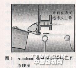 圖1中滾動著的是泡沫,按箭頭所示方向運動著的是織物,與織物表面緊密接觸的就是刮棒。而泡沫就是靠刮棒的作用。施加到織物表面的。