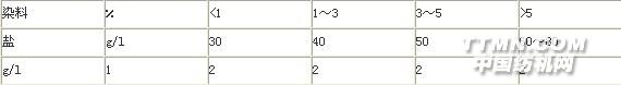三、建議染色工藝: 蛋白類纖維染色,由于其雙組份,一般都是染蛋白(因為蛋白極易沾色和上色),但其工藝的制訂應結合纖維的耐熱性、耐酸堿性及染色的最終效果去選擇燃料,并制訂染色工藝,結合中國國內情況,建議用棉用活性中、低溫燃料染色、具體的工藝如下:(僅供參考,建議在上產實施過程中試驗選擇。) 鹽/純堿用量