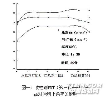 目前國(guó)內(nèi)外的改性劑都需在堿性條件下才能較多的陽(yáng)離子基團(tuán)進(jìn)入纖維,隨著pH值升高,涂料的上染率也提高,pH值達(dá)到9-10時(shí)才趨向平衡(見圖二),若pH值控制不當(dāng),將造成批與批之間的色差。而第三代環(huán)保型涂料改性劑PNT可以不用調(diào)節(jié)pH值就能改性,使纖維陽(yáng)離子化并賦予棉和涂料達(dá)到一定的親和性,可以免除pH值不同造成缸差(見圖一)。