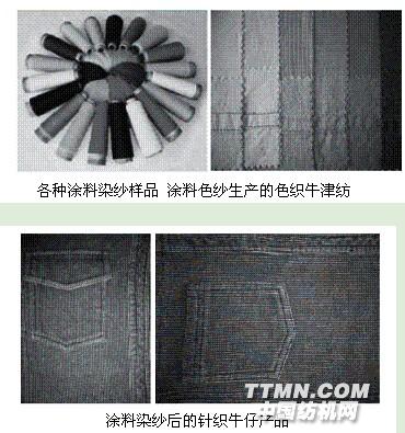用涂料筒子紗通過針織廠做成彩色針織牛仔、T恤、運(yùn)動(dòng)衣褲,再經(jīng)水洗,可獲得穿著更為舒適懸垂優(yōu)良,抗皺免燙的彩色針織牛仔系列。
