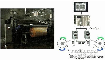 2. 控制系統方案 雙變頻器卷染機控制系統ATV31系列經濟型磁通矢量變頻器,通過Micro PLC(TSX3722)加CANOpen通訊擴展卡(TSXCPP110)作為主站,通過CANOpen總線控制2臺ATV31變頻器(內置CANOpen接口,作為從站)的調速和同步控制,同時配Magelis XBT-G 5.7”黑白觸摸屏進行系統操作和監控。.jpg)