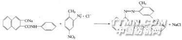 色基芳族伯胺化合物,經低溫重氮化反應形成重氮鹽,在織物上與色酚進行偶合反應形成偶氮染料,不溶于水。 大紅G色基形成: