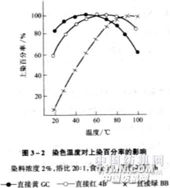 (一) 溫度效應 溫度對直接染料的上染速率影響不同 結構比較簡單的,容易溶解,對纖維親和力小,擴散速率高 結構比較復雜的,難以溶解,對纖維親和力高,擴散速率低 擴散速率高低是染料的一種特性