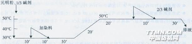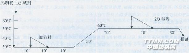 徐順成,趙四偉,劉培明,李樸素二、短流程活性染料預加鹽堿染色工藝 1.產品名稱:棉及其混紡、交織針織坯布 2.使用設備:溢流染色機 3.工藝流程:前處理后的坯布→加入元明粉,1/3堿劑→坯布運轉10分鐘后用10分鐘線性加入染料→運轉10分鐘后用1℃/min的速率升至50℃一60℃,運轉20分鐘后再用10分鐘線性加入2/3堿劑,保溫30分鐘→排液→水洗→酸洗→水洗→皂洗酶皂洗→水洗(對色)→柔軟。 4.工藝條件與升溫曲線 (1)適宜于適于乙烯砜活性基的活性染料