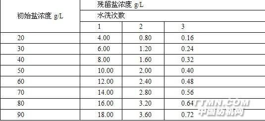 染后需立即洗除鹽、堿、助劑、未固色的浮色,水洗不及時,不凈,會產生色花和色牢度差等染疵。水洗時宜先用冷水,再用溫水,后用熱水洗凈鹽、堿后才可皂煮。表2 水洗后殘留鹽的濃度