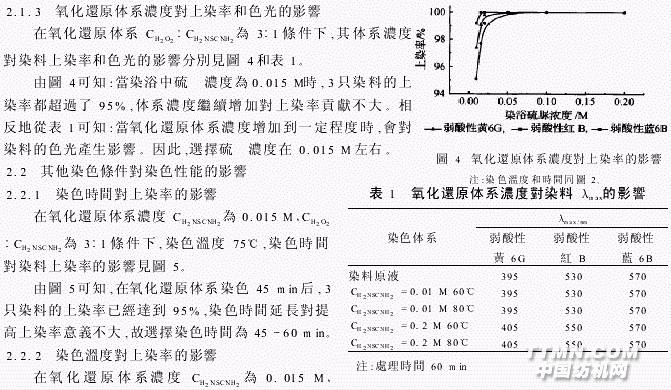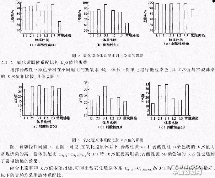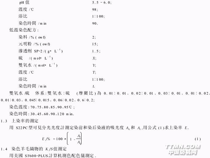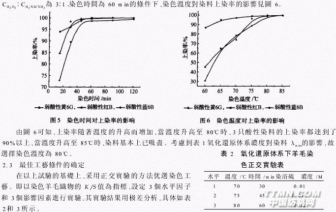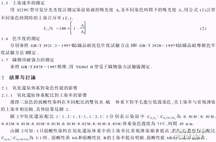 0 引 言 傳統(tǒng)的羊毛染色是經過嚴格地控制升溫過程,并在長時間高溫工藝下完成的,故容易導致羊毛織物泛黃,影響染色品的手感和鮮艷度,而且還會降低羊毛纖維的強力[1]。 本文采用的雙氧水/硫 氧化還原體系低溫染色法與以前的低溫染色方法不同,即在染浴中加入還原劑和氧化劑,而不需對被染物進行前處理和另加助劑,且具有上染速率快、勻染性好、染浴吸盡率高、染色時間短、染色溫度低等優(yōu)點[2]。該低溫染色方法還可用于酸性染料、活性染料對羊毛紗線、成衣的染色[3] 擬采用酸性染料在雙氧水/硫 體系下對羊毛織物進行染色,研究各工藝因素對染色效果的影響,從而探索最佳的染色工藝。 1 實驗部分 1.1 實驗材料和儀器 21tex精梳羊毛針織物;弱酸性紅B、弱酸性黃6G、弱酸性艷藍6B、滲透劑SP 2(均為工業(yè)品);硫 、雙氧水、元明粉(均為分析純試劑)。 RY-1261高溫染樣機(上海龍靈電子科技有限公司);S22PC型可見分光光度計(上海棱光技術有限公司);SF600 PLUS計算機測色配色儀(美國);YGO65H型電子織物強力試驗儀(萊州市電子儀器有限公司);PHS 3C精密pH計(上海精密儀器儀表有限公司)等。 1.2 染色方法 常規(guī)染色配方和氧化還原體系低溫染色配方分別如下,低溫染色工藝流程見圖1。常規(guī)配方: 染料/%(owf) 2; 元明粉/%(owf) 15; 滲透劑SP 2/(g‧L-1) 1.5;
