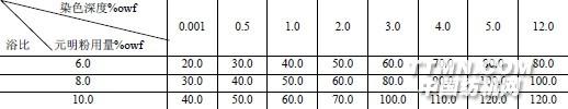 對以上三個影響因素分別在各自的論域中進行模糊化,其中,浴比的論域U 為[0,15],染色深度的論域V 為[0,15],元明粉用量的論域W 為[0,150]。均在其對應的論域中取3個語言變量: PS(大)、O(中)、NS(小)。將浴比值、染色深度及元明粉用量在各自的論域中進行模糊化,確定模糊規則,推理得到浴比值、染色深度與元明粉用量之間對應的模糊關系,通過模糊關系的確定,可以得到任意浴比值、染色深度下的元明粉用量。3. 染整工藝參數的模糊推理