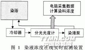 1 染料濃度在線監測原理 分光光度測試法是常用的染料濃度測定方法。染色過程中,染料由于逐漸吸附上染織物,在染浴中的濃度不斷降低。從染浴中連續或定時采樣,通過分光光 度計測試染浴吸光度的變化,可實現對染色過程的實時監控。對于水溶性染料染色(包括還原染料隱色體染色),試驗裝置原理如下: