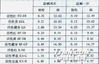 由于活性染料與酸性染料的染色條件存在較大的差異,一般選擇兩浴法染色。先用活性染料染棉,再用酸性染料染錦綸?;钚匀玖先旧に囉宣}堿兩步法和鹽堿一步法。從表5可見,采用鹽堿一步法工藝,雙活性基和一氯均三嗪染料對錦綸的沾染明顯較鹽堿兩步法改善,乙烯砜型的活性翠藍KN—G和活性寶藍KN—R對錦綸的沾染非常嚴重,采用鹽堿一步法不能解決沾污問題。采用鹽堿一步法染色工藝對一氯均三嗪染料的得色影響大,對雙活性基染料的得色影響較小。2.6預處理對活性染料染色K/S值的影響