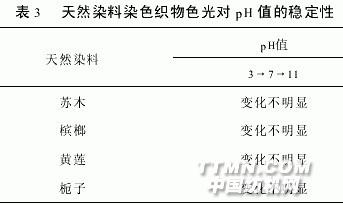 由圖6可見,稀土加入后能提高染料的上染率.這是因為稀土離子的外圍電子特殊構形使得它極易與含孤對電子的基團形成絡合物,在上染時形成植物染料-稀土-纖維的絡合結構,從而增加了染料的上染率,但是,當稀土濃度達到一個定值以上時,上染率基本保持不變,可見植物-稀土-纖維之間的結合由一定的絡合比,因而可達到一個飽和值.實驗證明,蘇木、檳榔、黃蓮、梔子的最佳稀土用量分別為0.5、0.8、0.4、1.0g/L.2.6染色織物牢度測試2.6.1pH對稀土媒染織物色光穩定性的影響 由表3可見,蘇木、檳榔、黃蓮、梔子的稀土染色織物對pH值有較高的色光穩定性,這對拓展稀土媒染劑在植物染料染色中的應用有十分重要的意義.
