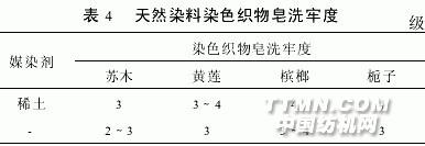 表4可見,加入稀土后,能提高織物染料的染色牢度,尤其以梔子加入稀土后染色牢度提高最大.3結論3.1植物染料的色素提取即可用水煮法,也可用乙醇萃取法.3.2用稀土作為媒染劑,能提高染料的上染率,改善染色牢度.3.3苧麻一次性上染率較差,故采用多次媒染方式3.4本研究對棉、真絲、毛進行了實驗,植物染料同樣可用于這類纖維織物的染色.3.5用稀土作為天然植物染料的媒染劑,在綠色產品的開發應用中有廣闊的市場.