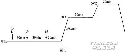 1 前言 活性染料以其優良的使用性能在針織物印染中有較廣泛的應用,而乙烯砜類染料(KN 型) 在各印染廠使用更為普遍。但此類染料的反應性和擴散性較均三嗪染料(X型、K型)為中等,而通常的染色工藝為中溫染色、固色,中溫加堿劑,這樣在大樣生產中極易造成條花和白斑,尤其是深藍、軍藍等深濃色,并且染出的坯布手感粗糙、顏色灰暗。本廠在近幾年的染色中,對KN 型染料在常溫機上染棉針織物的染色工藝,進行了不斷地實驗,對此,終于成功地摸索出一套成熟的染色工藝。2 染色機理 乙烯砜類活性染料( KN型) ,通常以較穩定的β- 羥基乙砜硫酸酯形式存在,染色時在堿性介質中先脫去硫酸酯基,形成活潑的乙烯砜基后,再和纖維素發生親核加成反應。3 染色過程3.1 工藝流程 坯布進缸→漂底→水洗→熱洗→水洗→染、固色→水洗→酸洗→水洗→皂煮→水洗→柔軟出布。3.2 工藝曲線(見圖1)