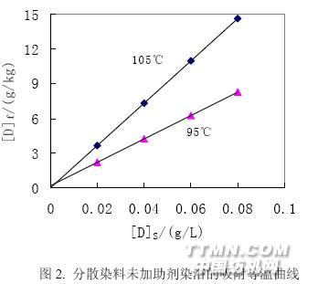 PLA 纖維染色熱力學(xué)研究(二)3. 結(jié)果與討論3.1 分散染料未加助劑染色時的吸附等溫線的繪制以染色平衡時殘液中的染料濃度[D]s(單位 g/L)根據(jù)染浴中投入染料量與纖維吸收的染料量之差計算。以 [D]f 為縱坐標(biāo),[D]s 為橫坐標(biāo),即可繪制吸附等溫線。