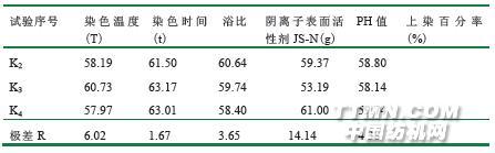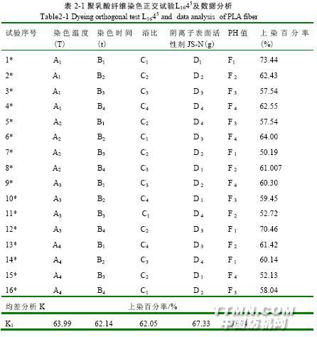 聚乳酸纖維染色工藝的優化研究(二)2 聚乳酸纖維染色工藝的優化2.1 正交實驗用C.I.分散紅74 對聚乳酸纖維進行染色,以上染百分率為評價指標,運用五因素、四水平的正交實驗方法,分析上述五種影響因素,結果如表2-1 所示。.jpg)